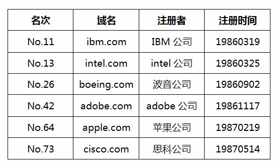 除了以上前10個域名,在排名前100的.com域名中,有一些至今依然為我們所熟知: